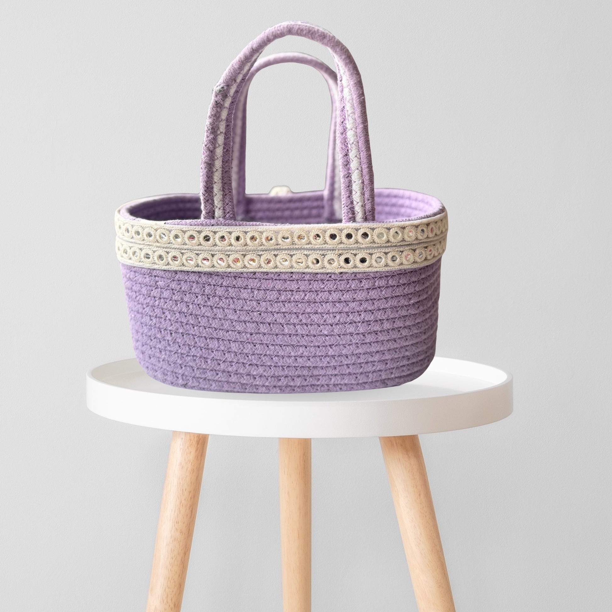 Elegant, handcrafted, and thoughtfully designed — this Luxe Lavender Handmade Rope Hamper Basket is the perfect choice for all your wedding gifting needs. Made with premium cotton rope, this basket features a beautiful cream lace border that adds a subtle festive charm to any celebration.